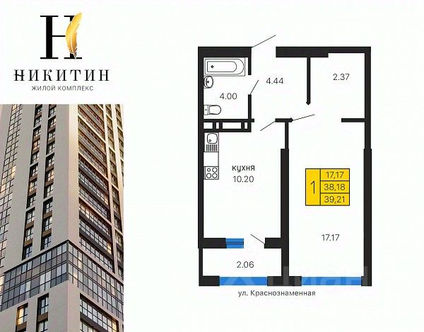 Продаётся 1-комнатная квартира в строящемся доме (Дом 1), срок сдачи: IV-кв. 2027, общей площадью 39.21 кв.м., на 20 этаже. Жилой комплекс "Никитин" расположен в Ленинском районе города Воронеж. Он представляет собой современный жилой комплекс, который включает в себя несколько многоэтажных домов, обустроенных территорию и парковочные места.