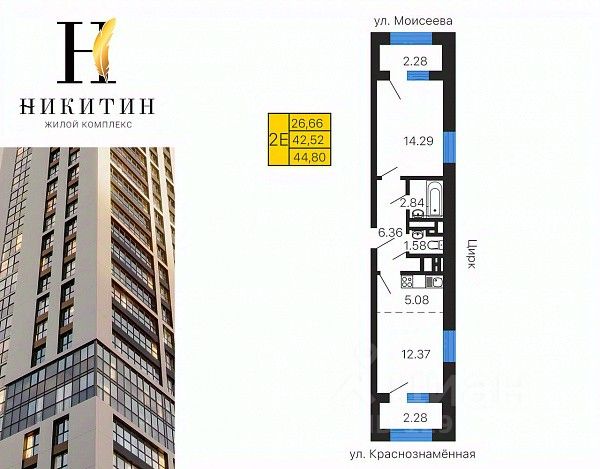 Продаётся 2-комнатная квартира в строящемся доме (Дом 1), срок сдачи: IV-кв. 2027, общей площадью 44.8 кв.м., на 19 этаже. Жилой комплекс "Никитин" расположен в Ленинском районе города Воронеж. Он представляет собой современный жилой комплекс, который включает в себя несколько многоэтажных домов, обустроенных территорию и парковочные места.