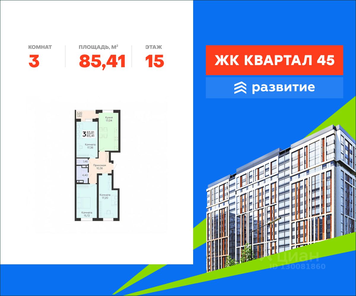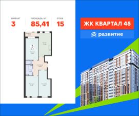 В продаже квартира площадью 85.41 кв. м с черновой отделкой. Квартира расположена на 15 этаже 18 этажного дома, в жилом комплексе комфорт-класса "Квартал 45".