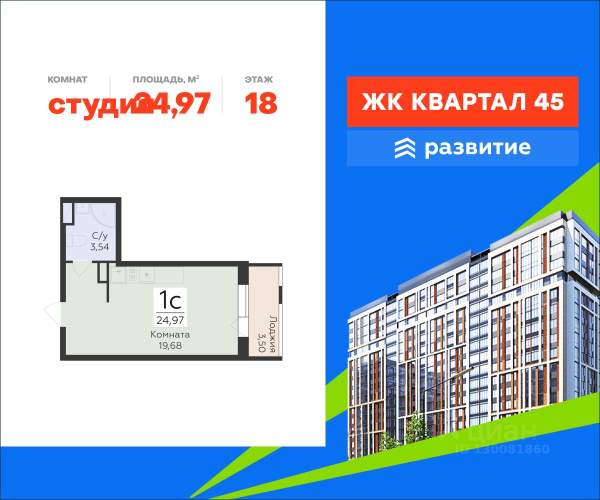 В продаже квартира площадью 24.97 кв. м с черновой отделкой. Квартира расположена на 18 этаже 18 этажного дома, в жилом комплексе комфорт-класса "Квартал 45".