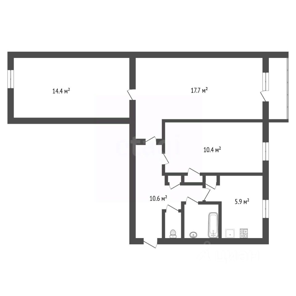 Планировка квартиры: 2 изолированные комнаты (10,4 м2 и 14,4 м2),одну проходную комнату(17,7 м2), санузел раздельный, кухню (5,6 м2).