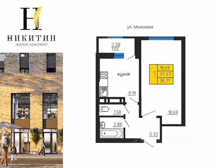 Продаётся 1-комнатная квартира в строящемся доме (Дом 2), срок сдачи: IV-кв. 2027, общей площадью 38.71 кв.м., на 11 этаже. Жилой комплекс "Никитин" расположен в Ленинском районе города Воронеж. Он представляет собой современный жилой комплекс, который включает в себя несколько многоэтажных домов, обустроенных территорию и парковочные места.