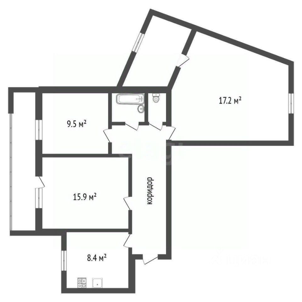Жилая площадь 42,6 кв. м. Комнаты 17,2; 15,9 и 9,5 кв.м. Высота потолков — 2,6 метра. По факту к спальне примыкает небольшая 4-ая комната 5,5 кв.м. с окном в сторону жилого комплекса Z-toun, где оборудовано рабочее место с компьютером. Можно использовать как гардеробную или установить тренажеры.