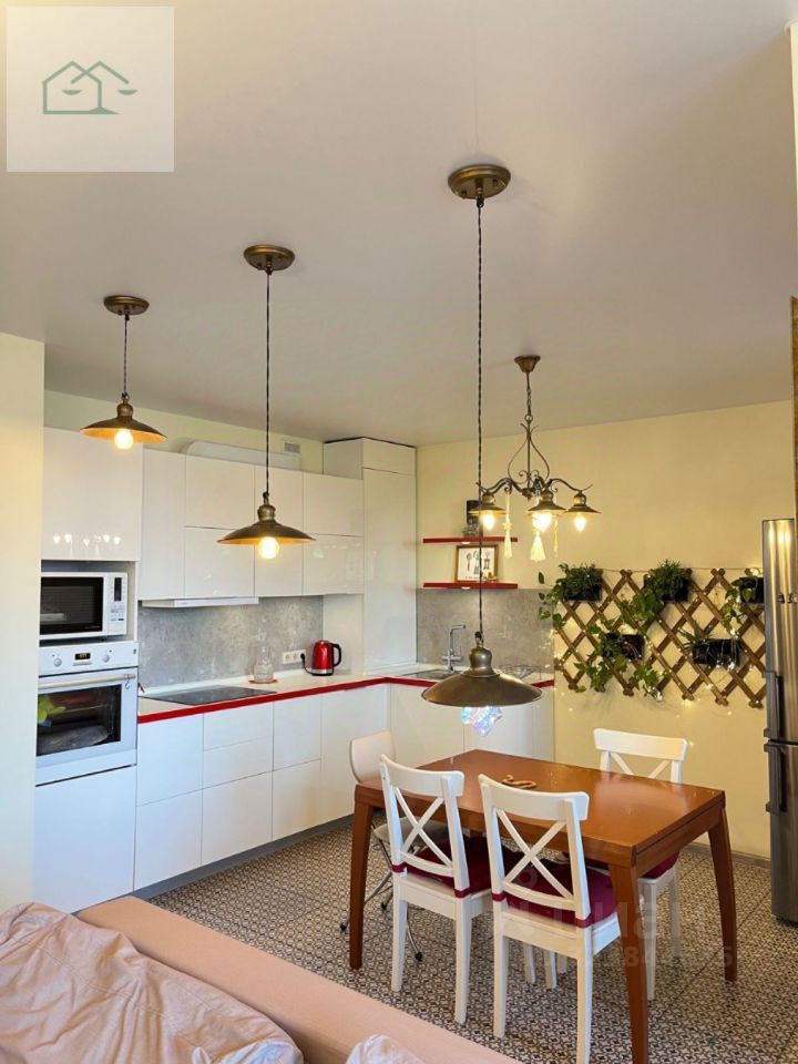 В стоимость квартиры входят мебель и техника: кухонный гарнитур, посудомоечная машина на 60 см, холодильник, духовой шкаф, варочная панель, вытяжка, микроволновка; сплит-система, диван, телевизор, стенка под телевизор; двуспальная кровать, встроенный шкаф и все системы хранения, комод; детская кровать, шведская стенка; стиральная машина, две тумбы под раковину.