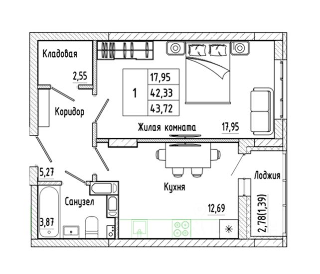Общая площадь43,72 м²