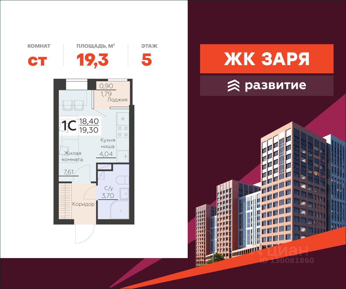 В продаже квартира площадью 19.30 кв. м с черновой отделкой. Квартира расположена на 5 этаже 14 этажного дома, в новом жилом комплексе "Заря" от федерального застройщика "Развитие".