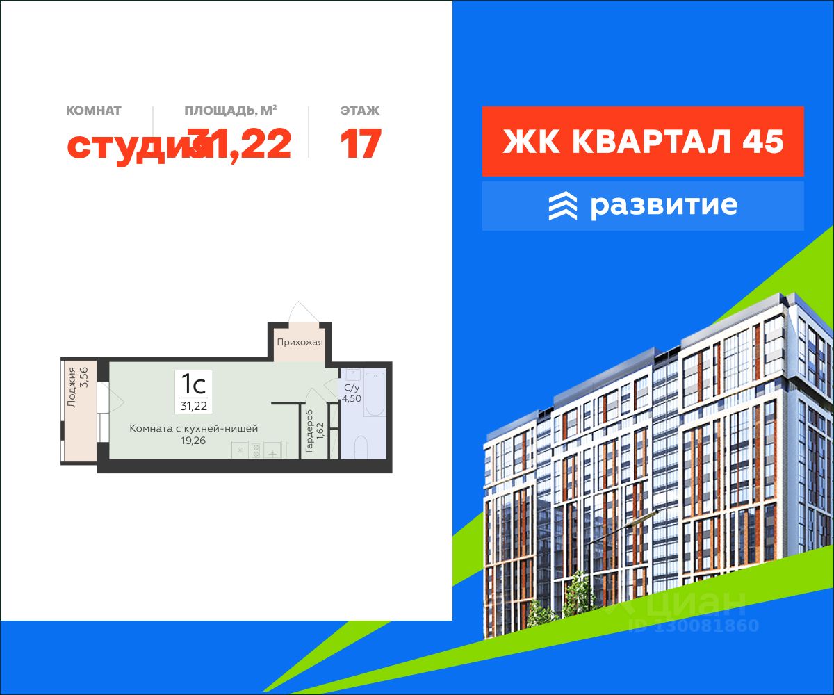 В продаже квартира площадью 31.22 кв. м с черновой отделкой отделкой. Квартира расположена на 17 этаже 18 этажного дома, в жилом комплексе комфорт-класса "Квартал 45".