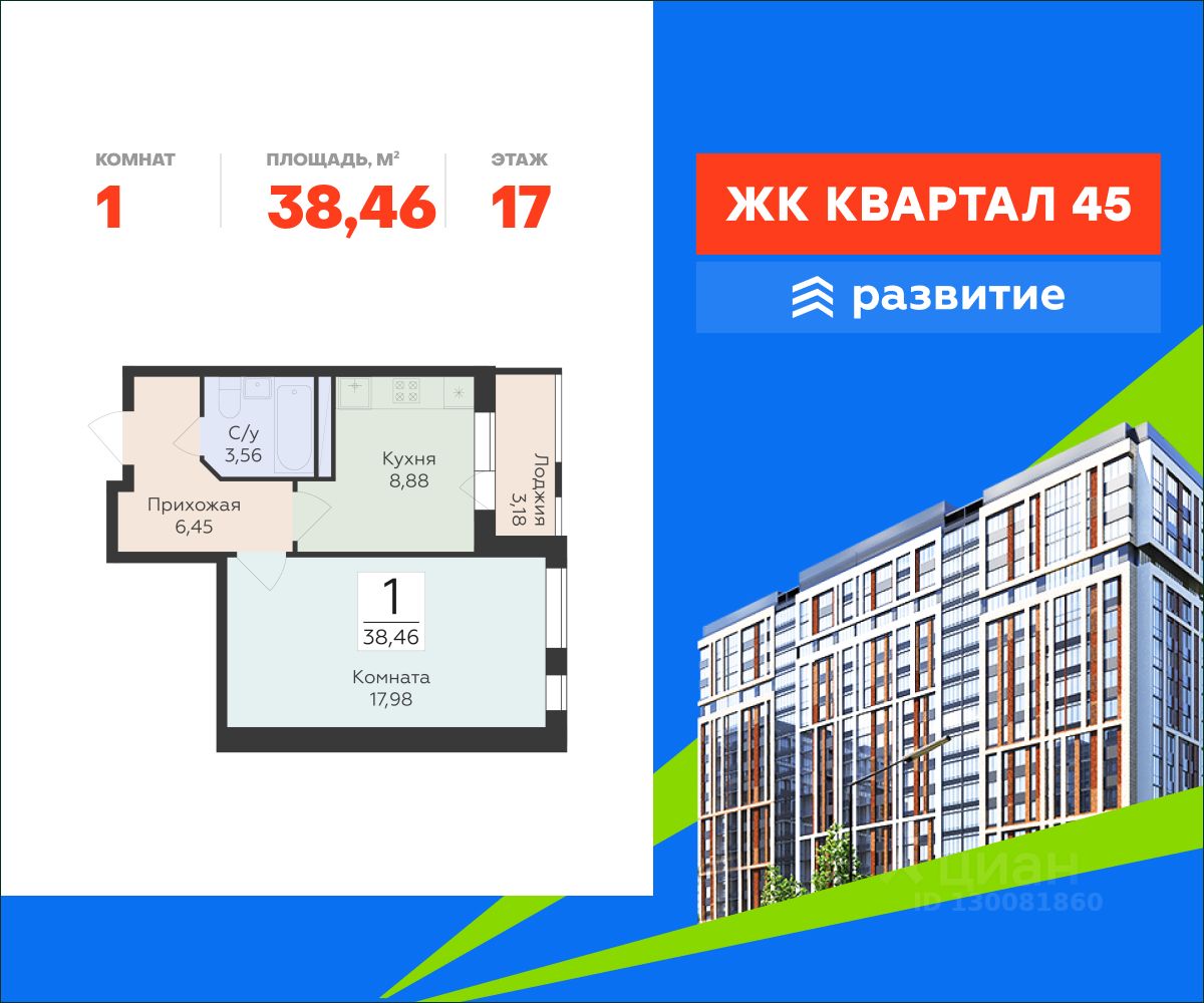 В продаже квартира площадью 38.46 кв. м с черновой отделкой отделкой. Квартира расположена на 17 этаже 18 этажного дома, в жилом комплексе комфорт-класса "Квартал 45".