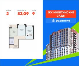 В продаже квартира площадью 53.09 кв. м с черновой отделкой. Квартира расположена на 9 этаже 20 этажного дома, в жилом комплексе комфорт-класса "Никитинские сады".