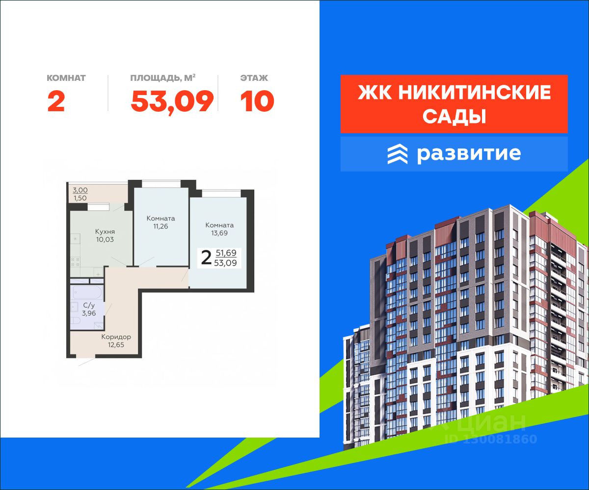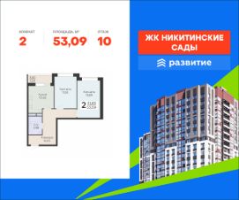 В продаже квартира площадью 53.09 кв. м с черновой отделкой. Квартира расположена на 10 этаже 20 этажного дома, в жилом комплексе комфорт-класса "Никитинские сады".