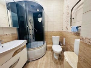 • Совмещенный санузел отделан плиткой, установлена современная душевая кабина.
