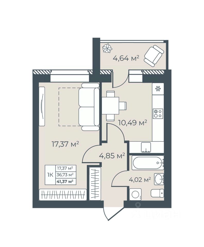 Общая площадь41,37 м²