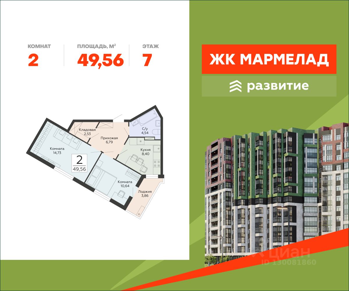 В продаже квартира площадью 49.56 кв. м черновая отделка. Квартира расположена на 7 этаже 13 этажного дома, в жилом комплексе комфорт-класса "Мармелад" (Федеральный застройщик - ГК "Развитие").