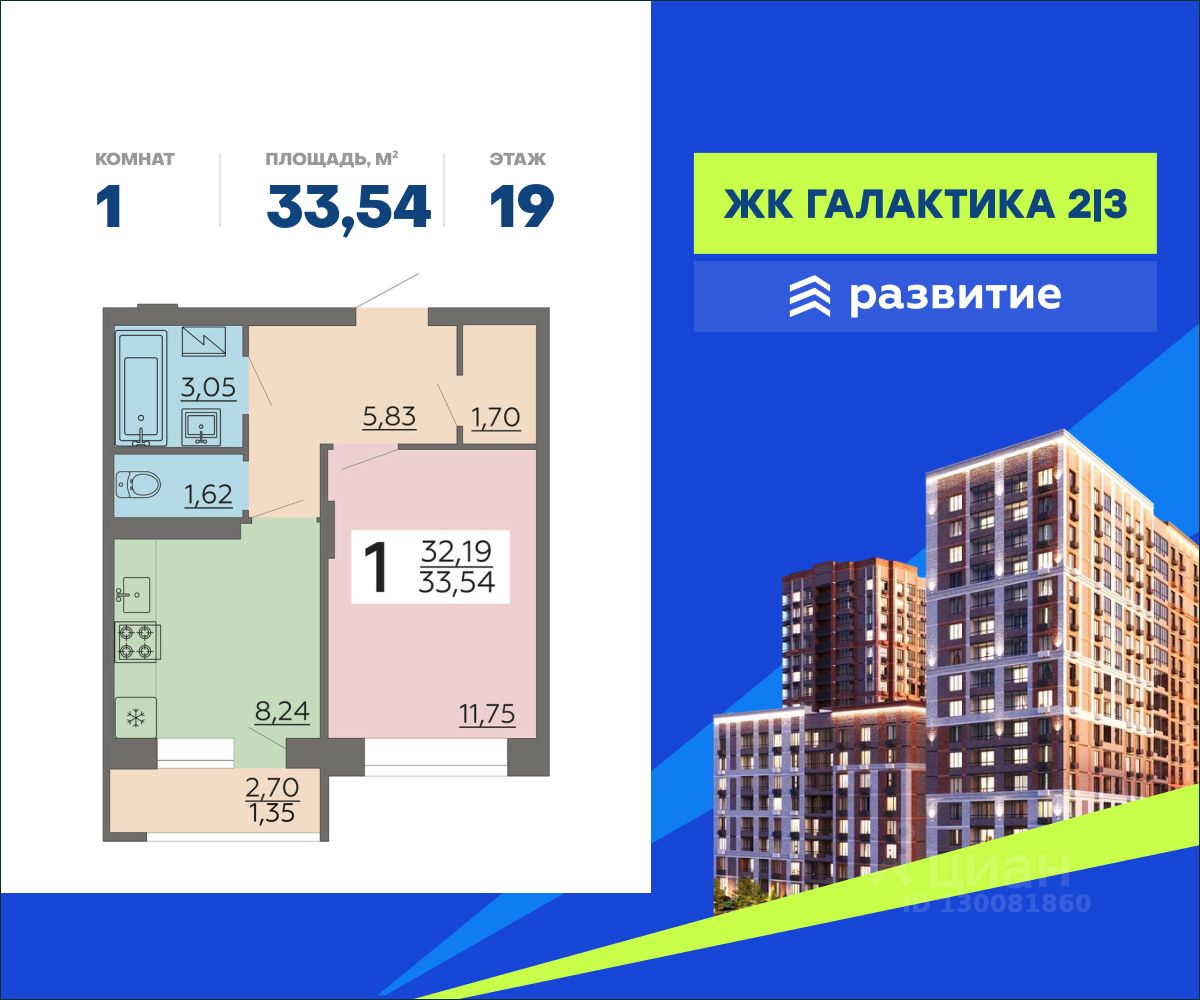 В продаже квартира площадью 33.54 кв. м с черновой отделкой. Квартира расположена на 19 этаже 22 этажного дома, в жилом комплексе комфорт-класса "Галактика 2|3".