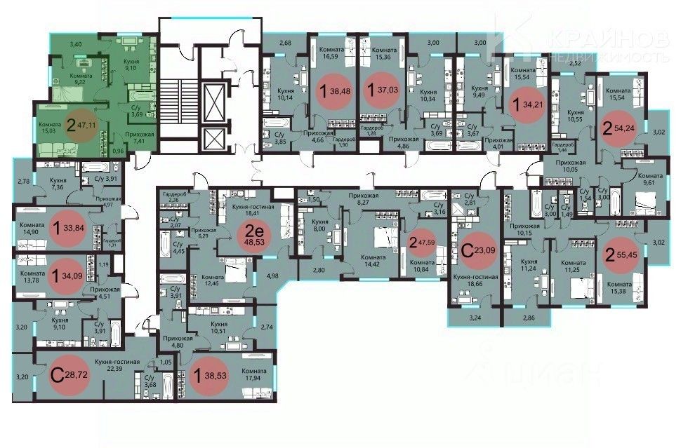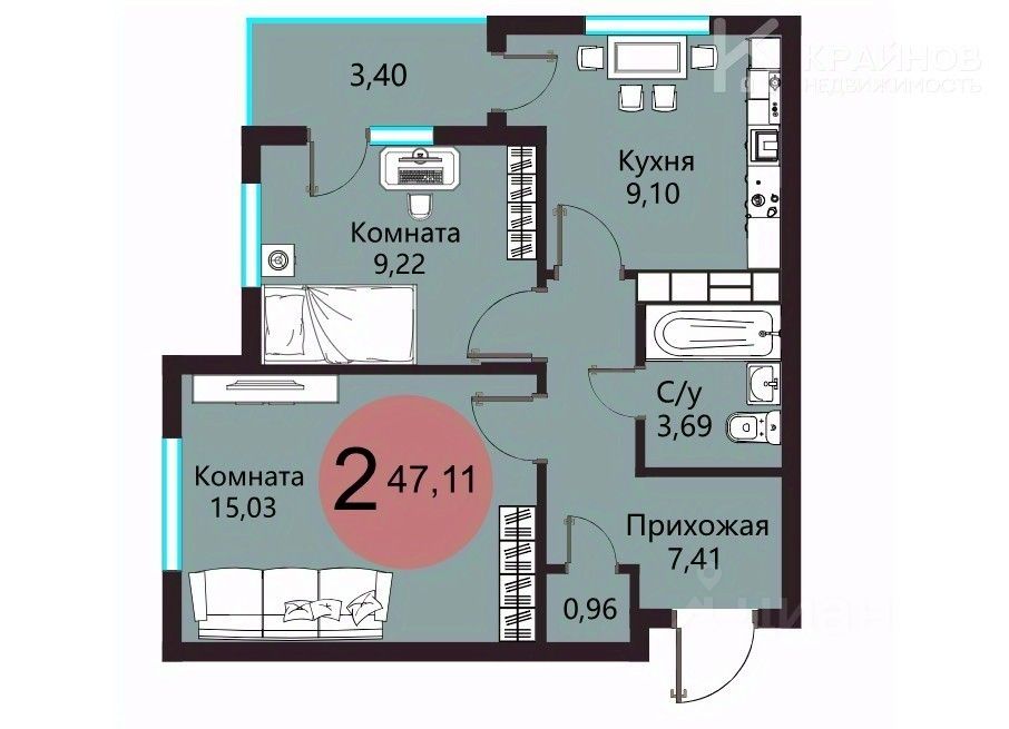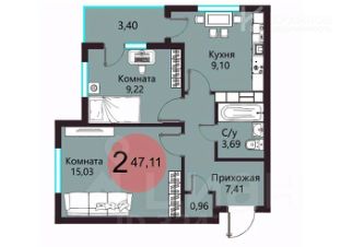 Площадь: Общая — 47,11 кв.м Гостиная — 15,03 кв.м Спальня с двумя окнами 9,22 кв.м Кухня — 9,10 кв.м