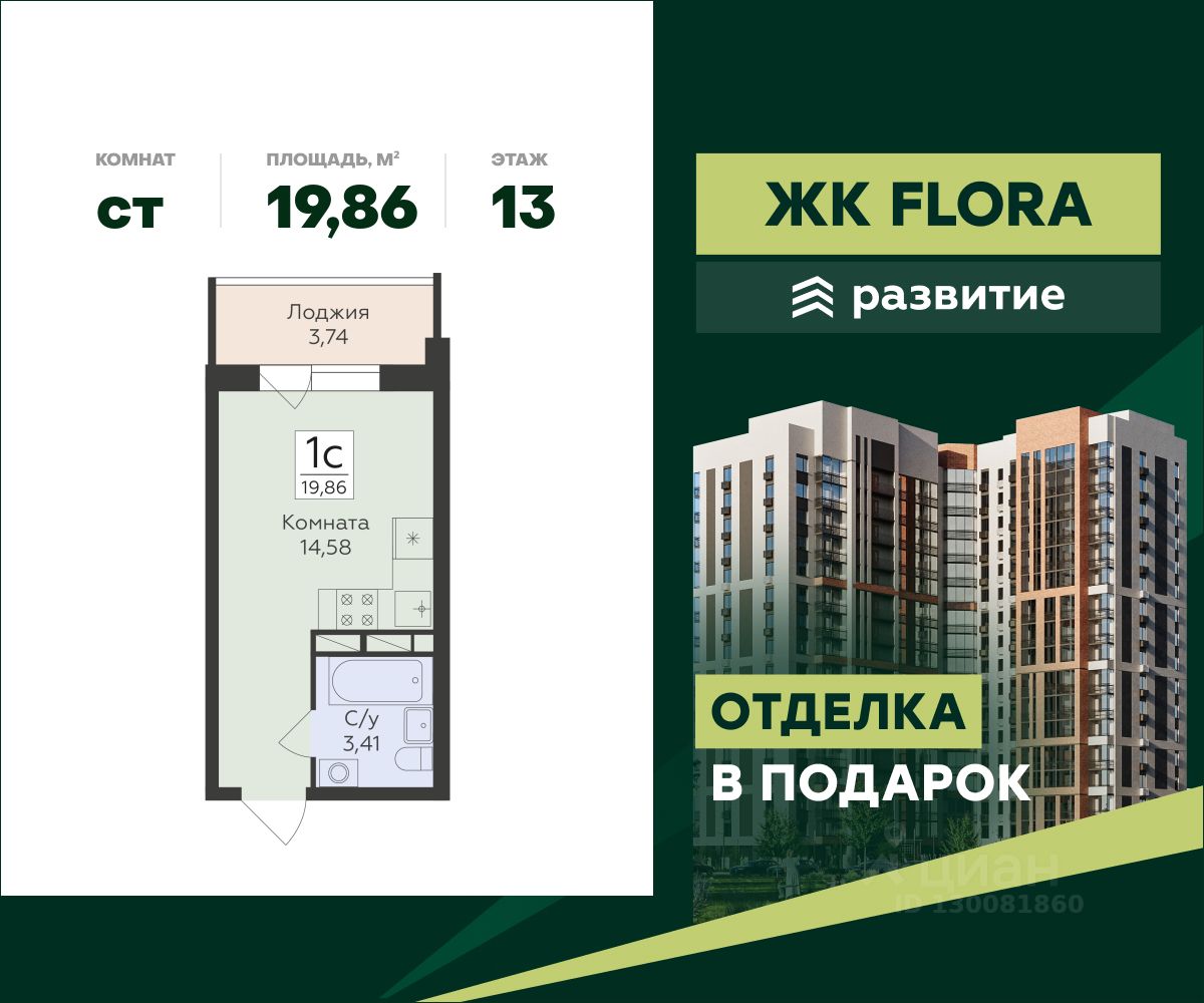 В продаже квартира площадью 19.86 кв. м с отделкой. Квартира расположена на 13 этаже 16 этажного дома, в жилом комплексе комфорт-класса FLORA ("Флора").