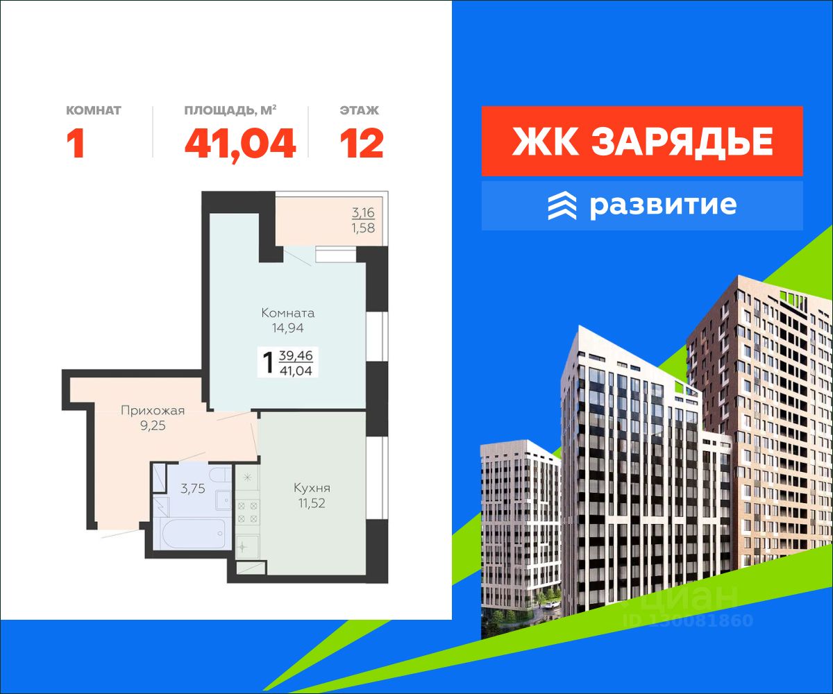 В продаже квартира площадью 41.04 кв. м с черновой отделкой. Квартира расположена на 12 этаже 15 этажного дома, в новом микрорайоне комфорт-класса "Зарядье" (Девелопер - федеральный застройщик ГК "Развитие").