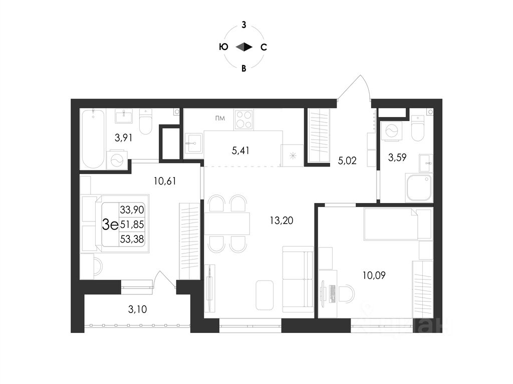 Общая площадь53,38 м²