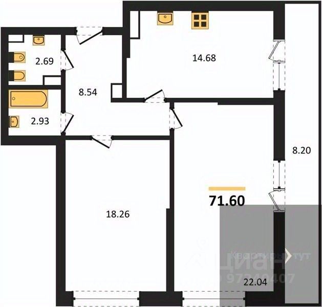 Квартира: 2 к 71,60 кв.м., 14 этаж в комплексе Бунин, 3 очередь, корп.1 (Секции 6,7), сдача: 2кв. , этажей: 23, адрес Воронеж г., Московский пр., д. 136, Застройщик: ВДК.