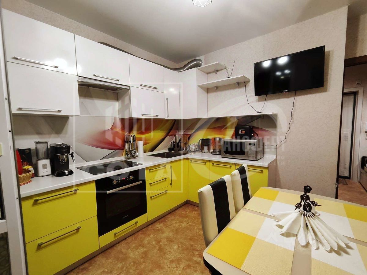 * На кухне современный и удобный гарнитур с фирменной духовкой, вытяжкой и варочной поверхностью и практичной раковиной;