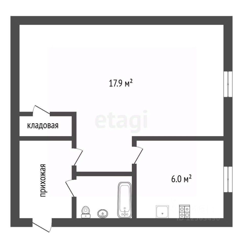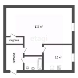Большая жилая комната 17,8 м2, кухня 6 м2, санузел совмещённый 3 м2, коридор 2,7 м2, также есть кладовая 0,7 м2.