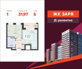 В продаже квартира площадью 31.97 кв. м с черновой отделкой. Квартира расположена на 5 этаже 12 этажного дома, в новом жилом комплексе "Заря" от федерального застройщика "Развитие".