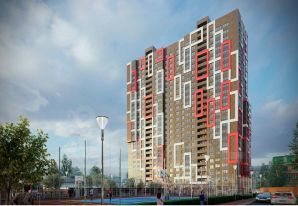 Дом красивый и заметный внешне. Архитектурная выразительность здания достигается ритмичным рисунком контрастных декоративных элементов с гармоничным сочетанием коричневого, красного и бежевого цветов.