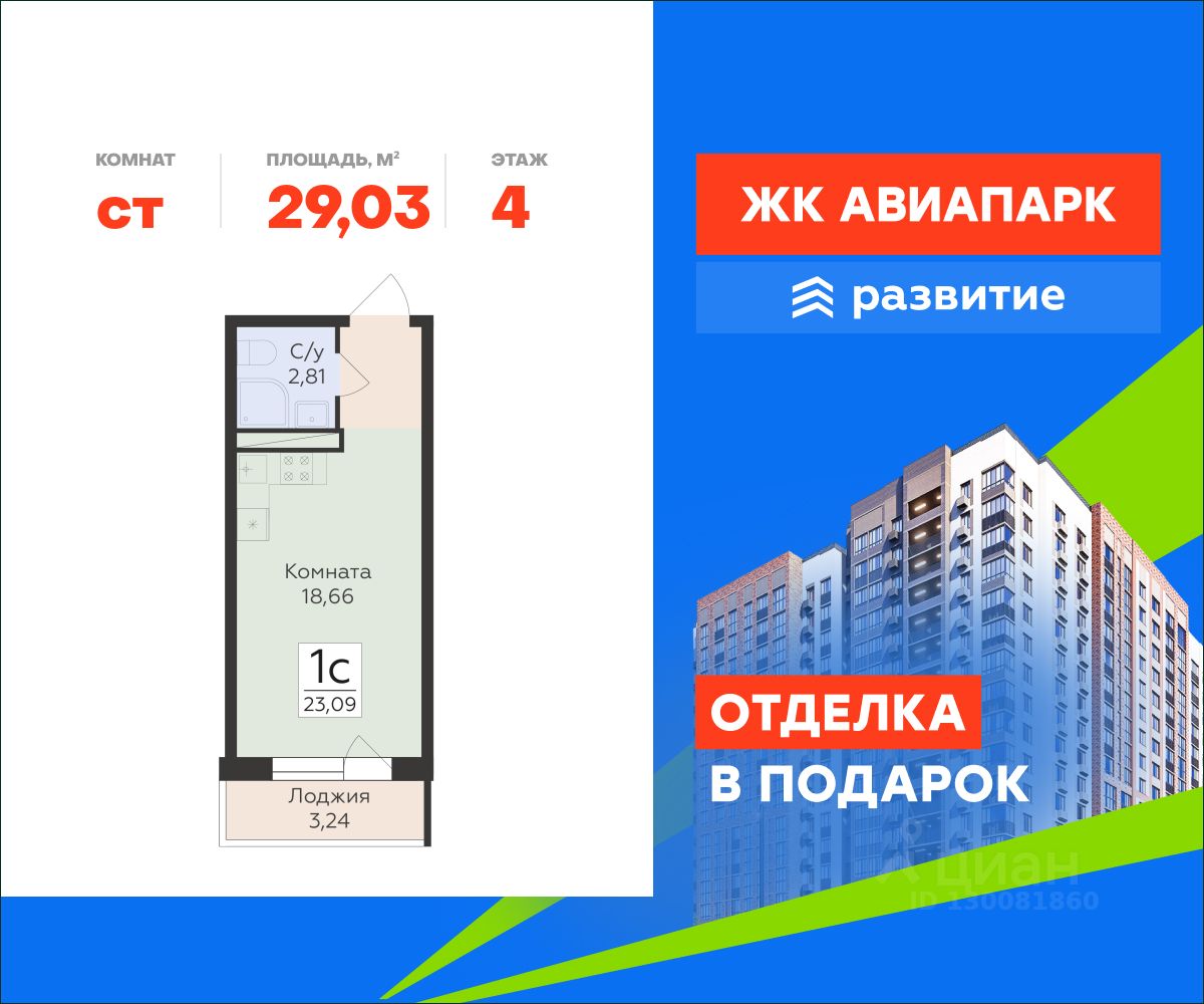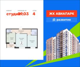 В продаже квартира площадью 29.03 кв. м с черновой отделкой. Квартира расположена на 4 этаже 18 этажного дома, в новом жилом квартале "Авиапарк".