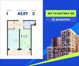 В продаже квартира площадью 42.97 кв. м с черновой отделкой. Квартира расположена на 2 этаже 21 этажного дома, в жилом комплексе комфорт-класса "Галактика 2|3".