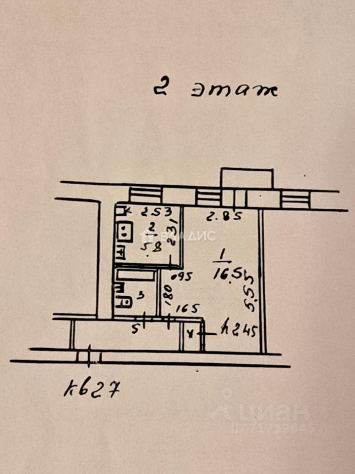 Жилая площадь составляет 16,5 кв. м, а площадь кухни — 5,8 кв. м. В квартире есть балкон, а окна выходят во двор. Квартира не угловая, с косметическим ремонтом, что позволяет новым владельцам сразу заселиться или обновить интерьер по своему вкусу.