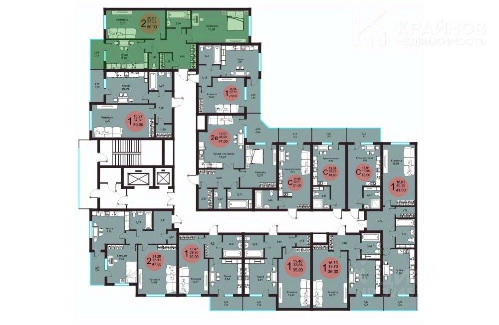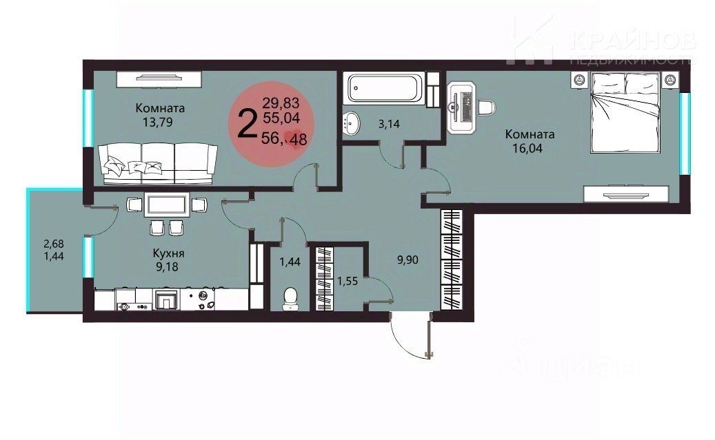 Общая 56,19 кв.м Комнаты 13,79/ 16,04 кв.м Кухня с выходом на балкон 9,18 кв.м
