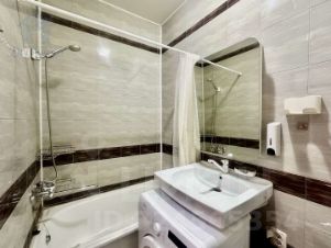 Аккуратный санузел не только практичен, но и радует глаз благодаря качественной отделке и продуманному дополнительному освещению.