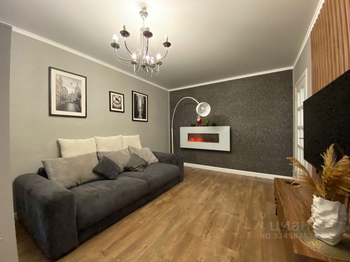 Гостиная светлая и просторная с биокамином, который останется новым владельцам. На стенах качественные обои, декоративный камень, на полу ламинат высокого класса.