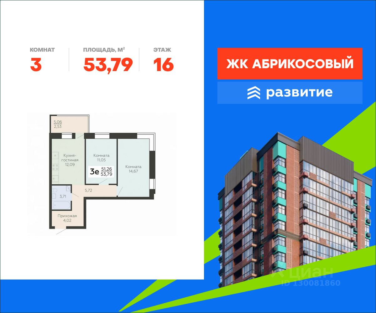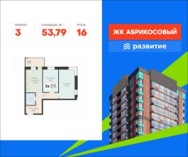 В продаже квартира площадью 53.79 кв. м с черновой отделкой. Квартира расположена на 16 этаже 19 этажного дома, в жилом комплексе комфорт-класса "Абрикосовый" (Застройщик - федеральный застройщик ГК "Развитие").