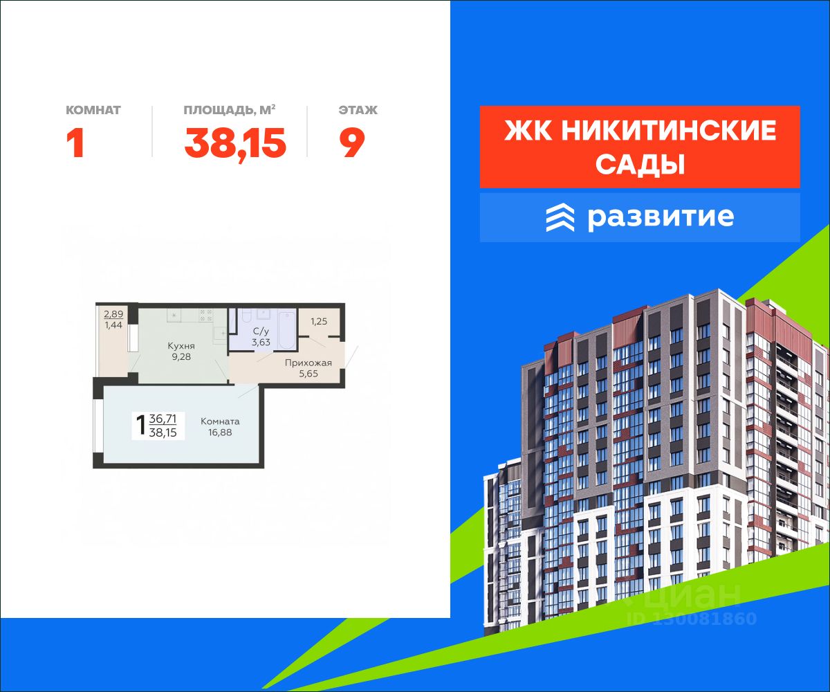 В продаже квартира площадью 38.15 кв. м с черновой отделкой. Квартира расположена на 9 этаже 20 этажного дома, в жилом комплексе комфорт-класса "Никитинские сады".