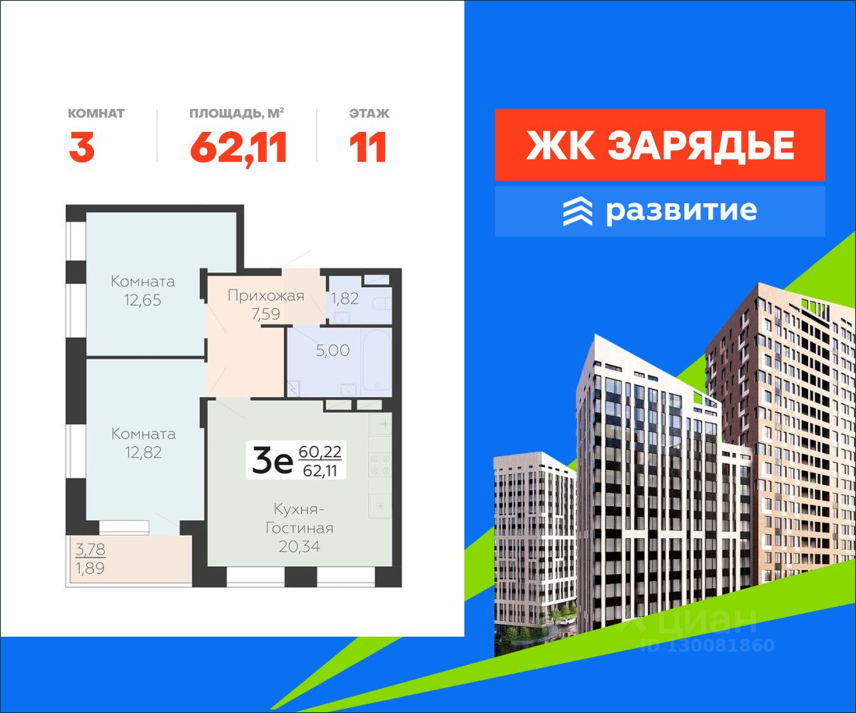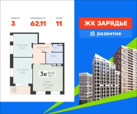 В продаже квартира площадью 62.11 кв. м с черновой отделкой. Квартира расположена на 11 этаже 21 этажного дома, в новом микрорайоне комфорт-класса "Зарядье" (Девелопер - федеральный застройщик ГК "Развитие").