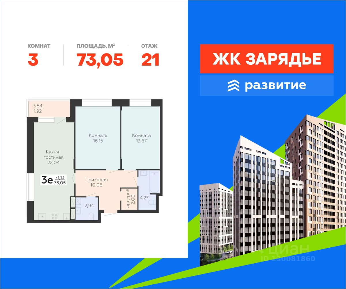 В продаже квартира площадью 73.05 кв. м с черновой отделкой. Квартира расположена на 21 этаже 21 этажного дома, в новом микрорайоне комфорт-класса "Зарядье" (Девелопер - федеральный застройщик ГК "Развитие").