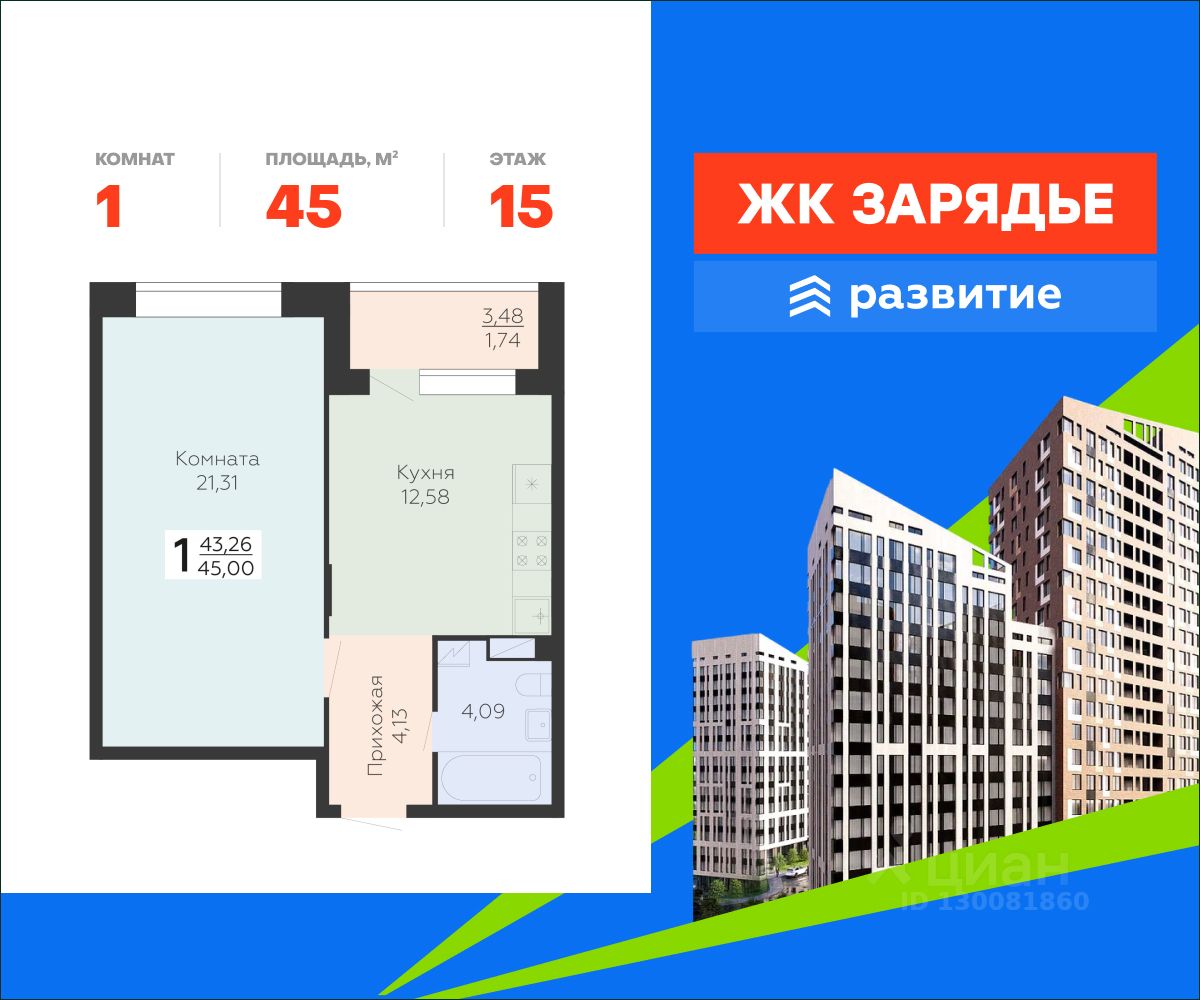 В продаже квартира площадью 45.00 кв. м с черновой отделкой. Квартира расположена на 15 этаже 15 этажного дома, в новом микрорайоне комфорт-класса "Зарядье" (Девелопер - федеральный застройщик ГК "Развитие").