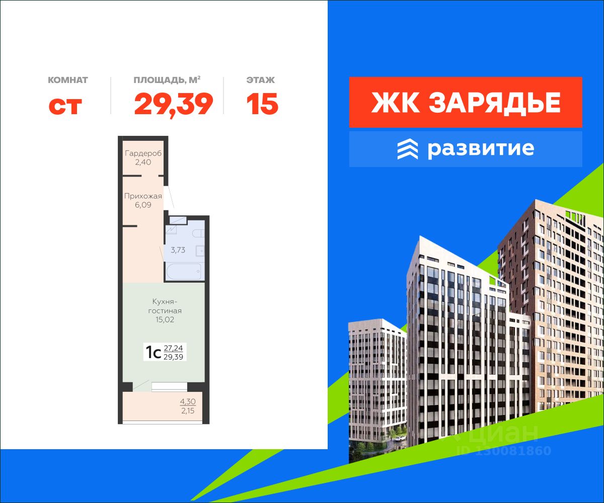 В продаже квартира площадью 29.39 кв. м с черновой отделкой. Квартира расположена на 15 этаже 15 этажного дома, в новом микрорайоне комфорт-класса "Зарядье" (Девелопер - федеральный застройщик ГК "Развитие").