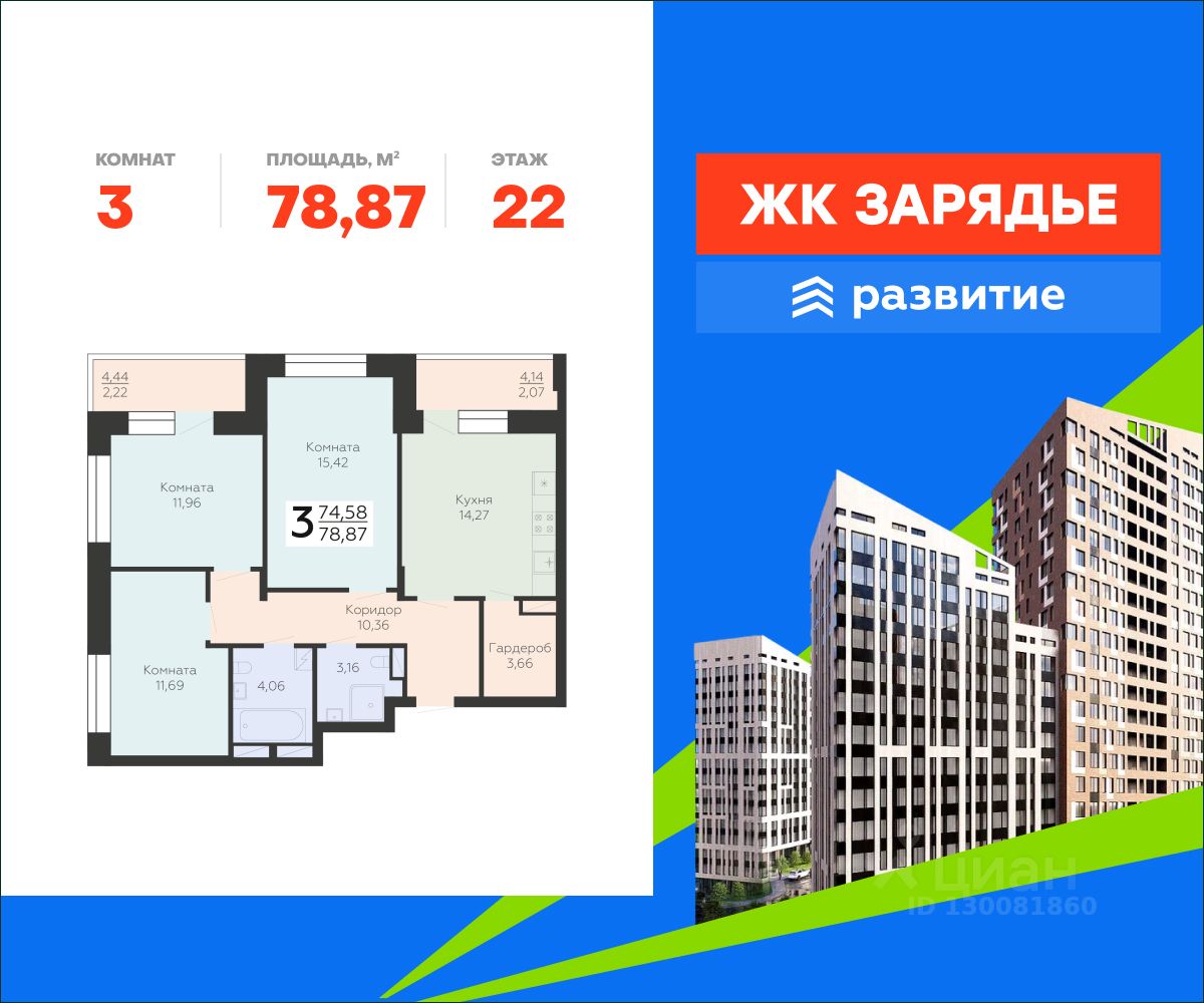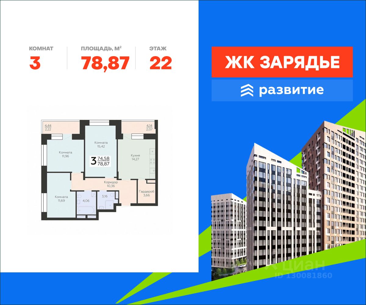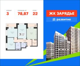 В продаже квартира площадью 78.87 кв. м с черновой отделкой. Квартира расположена на 22 этаже 25 этажного дома, в новом микрорайоне комфорт-класса "Зарядье" (Девелопер - федеральный застройщик ГК "Развитие").