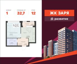 В продаже квартира площадью 32.70 кв. м с черновой отделкой. Квартира расположена на 12 этаже 14 этажного дома, в новом жилом комплексе "Заря" от федерального застройщика "Развитие".