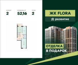 В продаже квартира площадью 52.16 кв. м с черновой отделкой. Квартира расположена на 2 этаже 17 этажного дома, в жилом комплексе комфорт-класса FLORA ("Флора").