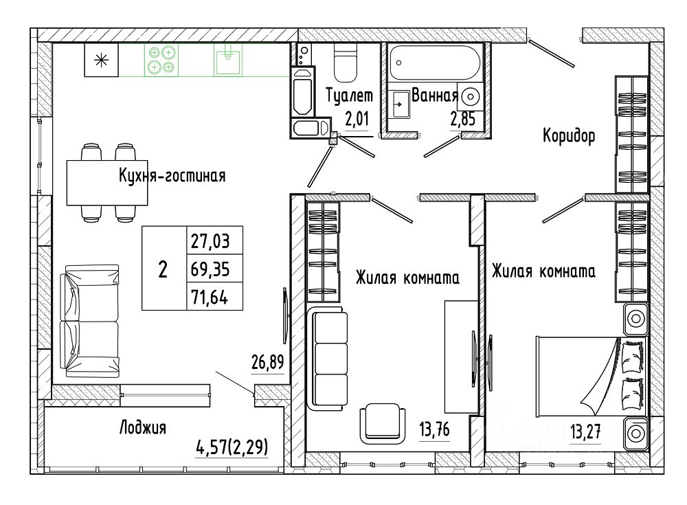 Продаётся 2-комнатная квартира в строящемся доме (Дом 2), срок сдачи: II-кв. 2029, общей площадью 71.64 кв.м., на 2 этаже. Жилой комплекс "Алые паруса" представляет собой 19-этажный жилой дом на улице Мопра, 16 вблизи парка "Алые паруса".