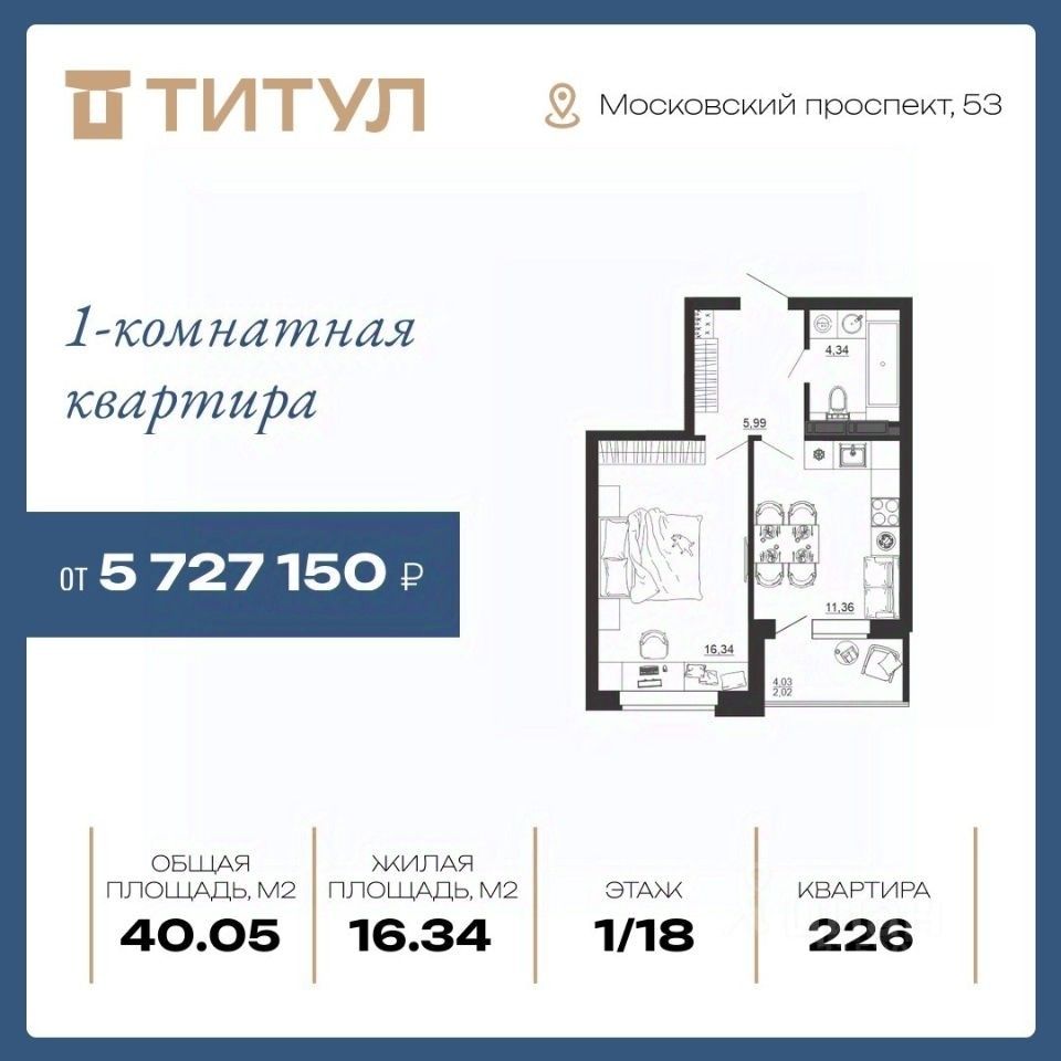 Продаётся 1-комнатная квартира в строящемся доме (Секция 2), срок сдачи: IV-кв. 2026, общей площадью 40.05 кв.м., на 1 этаже. Новый жилой комплекс "Титул" от Специализированного застройщика ООО "Рента" расположен по адресу: г. Воронеж, по ул. Московский проспект.