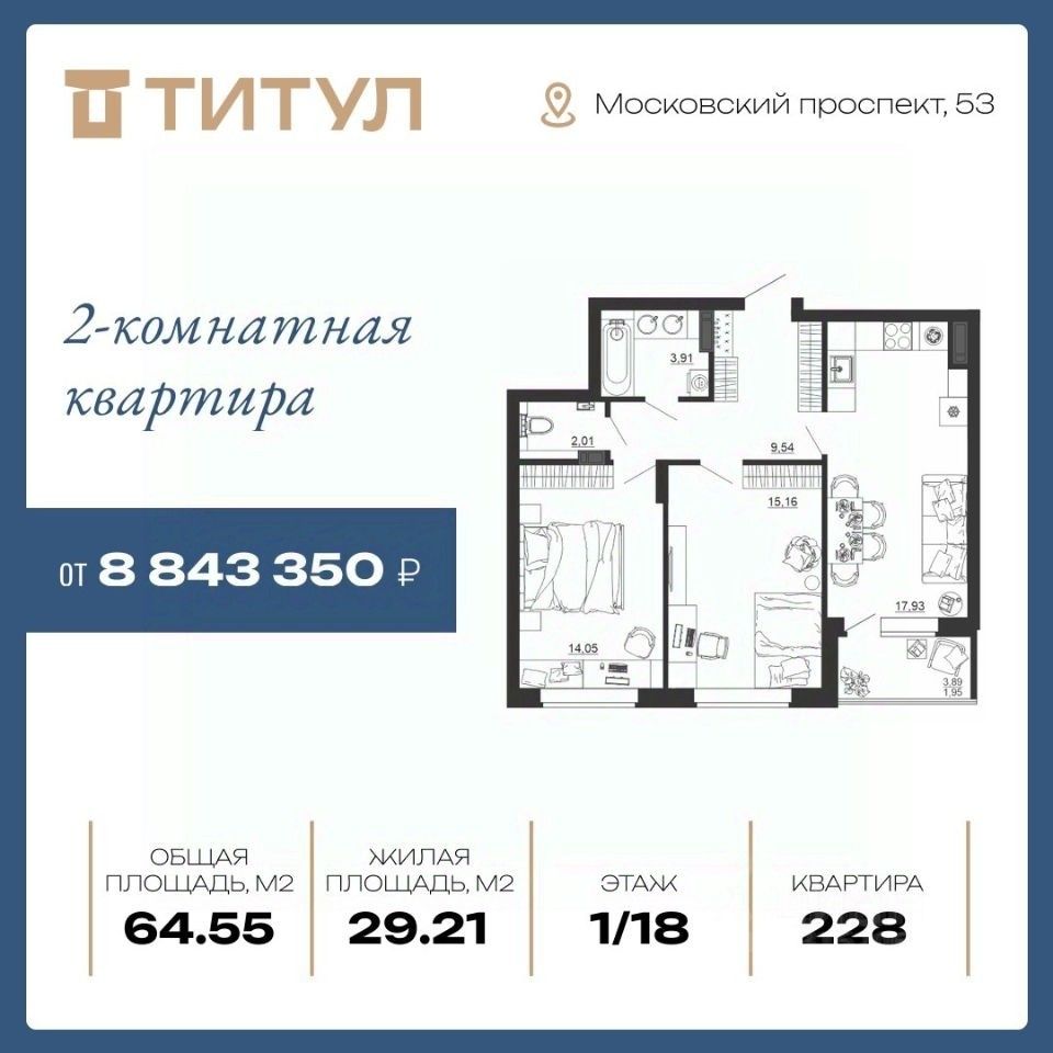 Продаётся 2-комнатная квартира в строящемся доме (Секция 2), срок сдачи: IV-кв. 2026, общей площадью 64.55 кв.м., на 1 этаже. Новый жилой комплекс "Титул" от Специализированного застройщика ООО "Рента" расположен по адресу: г. Воронеж, по ул. Московский проспект.