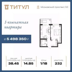 Продаётся 1-комнатная квартира в строящемся доме (Секция 2), срок сдачи: IV-кв. 2026, общей площадью 38.45 кв.м., на 1 этаже. Новый жилой комплекс "Титул" от Специализированного застройщика ООО "Рента" расположен по адресу: г. Воронеж, по ул. Московский проспект.