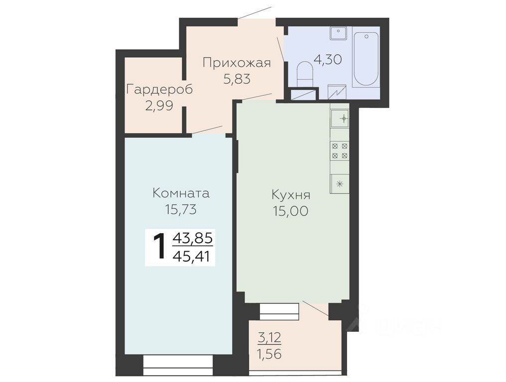 Общая площадь45,41 м²