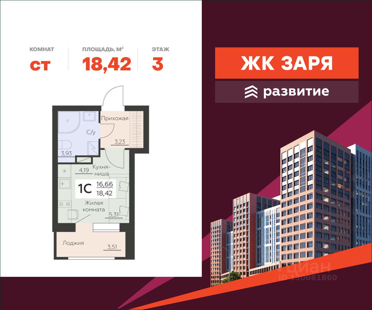 В продаже квартира площадью 18.42 кв. м с черновой отделкой. Квартира расположена на 3 этаже 14 этажного дома, в новом жилом комплексе "Заря" от федерального застройщика "Развитие".