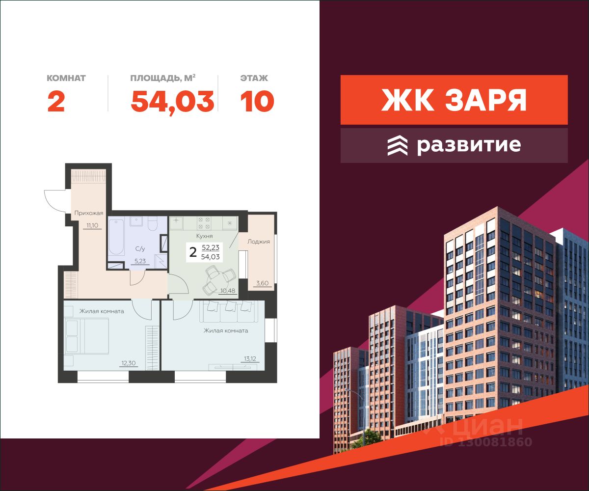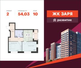 В продаже квартира площадью 54.03 кв. м с черновой отделкой. Квартира расположена на 10 этаже 14 этажного дома, в новом жилом комплексе "Заря" от федерального застройщика "Развитие".