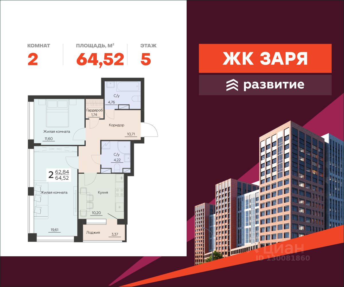 В продаже квартира площадью 64.52 кв. м с черновой отделкой. Квартира расположена на 5 этаже 16 этажного дома, в новом жилом комплексе "Заря" от федерального застройщика "Развитие".